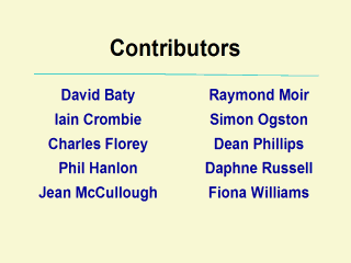 Scotland. The first version of Studying Populations was created by subject experts in the collaborating departments of epidemiology in the universities of Aberdeen, Dundee and Glasgow and the software and authoring skills of the Computers in Teaching Unit in the University of Dundee. The slide lists in alphabetical order those who were involved. The first version was released in 1997. The current (3rd) version was released in 2002 and updated in 2003. |