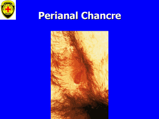 | This picture shows a perianal chancre. It is atypical in that the lesion follows the lines of cleavage and is therefore elongated. Perianal chancres are seen in people who practice anal intercourse, males and females. It is always important not to assume types of sexual practices when confronted with lesions in atypical locations. |