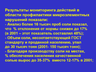 | - Результаты социологических исследований показывают, что уровень осведомленности школьников в вопросе профилактики йододефицитных нарушений вырос до 82-87% (2001 - 60%) |
