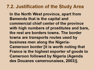 are used by these businessmen who come from all over Cameroon: a) Ndu → Ntumbaw → Sabong Gari → Nwa → Nigeria. b) Ndu → Binka → Mayo Binka → Lus → Nigeria. c) Ndu→ Binka → Nkambe → Ako → Abongshi → Nigeria. d) Ndu → Binka → Nkambe → Misage → Dumbo→ Nigeria. e) Bamenda → Befang → Banakuma → Baworu → Nigeria. In addition, because of ethnic clashes in the Taraba and Benue states of Nigeria since two years ago, there is a concentration of pastoral refugees in Abongshie, Ako, Nkambe, Mayo-Binka, Sabong Gari, and Nwa. Because of the relative peace that reigns in Cameroon many Nigerian business men also troop into the country through these routes. Long-distant truck drivers with their characteristic multiple partners on settlements along these routes are common. Hence, these are high HIV/AIDS prone regions. Trans-border (Cameroon-Nigeria and vice-versa) transport workers on Rivers Donga and Mantung are also high risk groups. |
