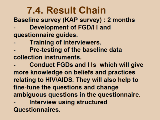 the intervention : 2 months Preparation of educational messages and IEC materials Preparation of training manuals. Preparation of monitoring and evaluation instruments. Pre-test of the instruments. Identification of FBOs and associations Preparation of a plan of data analyses. Intervention :12 months Training of FBOs leaders (Priests, Pastors, Imams, etc) on the strategy of HIV/AIDS prevention, care and mitigation Training of local supervisors on major themes and detailed implementation of the project. Training of animators on the strategy of HIV/AIDS prevention, care and mitigation. Training of FBOs associations (youths, choirs, elders, etc). Congregational mobilization and social marketing on the strategy. Formation of AIDS clubs within FBOs associations. Orientation of the health staff on the research strategy. Put IEC materials in FBOs. Supervision of field activities. Mid-term evaluation. Workshop with FBO stakeholders. Final evaluation 2 months KAP survey Verification of registers FGD and I Is with FBO leaders and members. Data analysis: 1 month Restitution of the results: 1 month Institutionalization of the intervention program: 4 months |