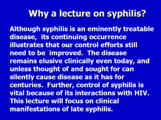 | The manifestations of late syphilis are rarely seen in the developed world due to availability of therapy for early syphilis. They may be more common in areas of the world where syphilis is not recognized in its early stages and therapy is not given. |