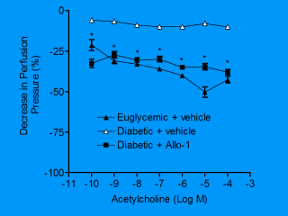 | Effect of Allo-1 in the vasorelaxant effect of the endothelium-dependent agonist acetylcholine in the renal vascular bed. The data are expressed as mean ± SEM of 8 experiments. * p<0.05 vs. responses obtained in tissues from diabetic rabbits and * p<0.05 vs. responses obtained in tissues from euglycemic rabbits. |