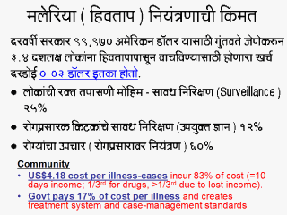 Malaria control is a serious concern for healthcare professionals, in Henan Province of China. Presented slide shows that in this particular example the cost of illness per person is over 100 times higher than the cost of prevention. http://www.pitt.edu/~super1/lecture/lec5501/008.htm Professor Xi-Li Liu, TDR/WHO Project Principal Investigator Henan Provincial Institute of Parasitic Diseases, China |