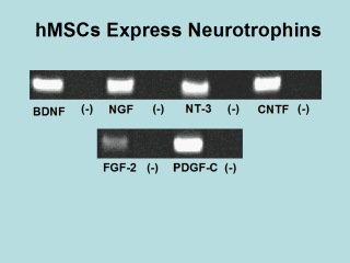 RT-PCR shows the expression of mRNA’s encoding for brain-derived neurotrophic factor (BDNF), nerve growth factor (NGF), neurotrophin 3 (NT-3), ciliary neurotrophic factor (CNTF), fibroblast growth factor 2 (FGF-2), and platelet-derived growth factor C (PDGF-C). All samples were DNase treated. First strand synthesis was omitted as a negative control (-).     (J.R. Munoz, J.A.Semon, R.L.Reger, C.A.Gregory, D. J. Prockop & J. L. Spees, submitted)