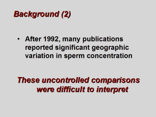 Following the Carlsen analysis, many researchers used historical data to compare semen quality among cities or countries, and many reported significant geographic variation in sperm concentration. |