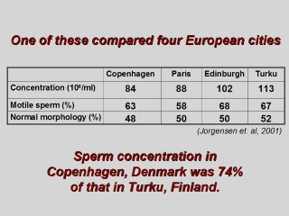 One of these multi-center studies compared semen quality among four European cities. This study, published by Jorgenson and colleagues in 2001, showed that sperm concentration in Copenhagen, Denmark was significantly lower than that in Turku, Finland.