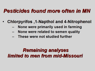 Few Minnesota men had detectable levels of agricultural pesticides, but many pesticides were detected in samples from Missouri men. While three pesticides were found more often in Minnesota men, these were metabolites that result, primarily, from non-agricultural sources. None of these were related to semen quality and were not studied further. We then limited further analyses to Missouri men.