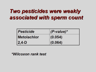 Two other herbicides, metolachlor and 2, 4-D were less strongly associated with semen quality, with p-values slightly greater than 0.05. |
