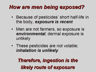 While it is clear that men in Missouri are being exposed to these current-use pesticides, the route of exposure is not known. Because the half-life of these pesticides in the body is quite short, we know exposures are recent. Because these men were not farmers, we know exposure is not occupational. Other data suggest that Inhalation and dermal exposure are less likely routes of exposure than ingestion. |