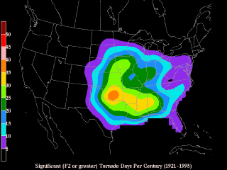Significant (F2 or greater) Tornado Days Per Century (1921-1995)