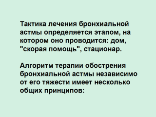 сыворотки, газов крови). 2. Провести физикальное обследование для оценки тяжести обострения и выявления возможных осложнений (пневмоторакса, пневмомедиастинума, ателектазов, пневмонии и др.). 3. Определить характер проводимой ранее терапии (количество доз бронхолитического препарата, путь введения, время, прошедшее с момента последнего приема бронхолитика, применялись ли глюкокортикостероиды (ГКС), их дозы). 4. Уточнить длительность обострения и его возможные причины, предшествующие госпитализации по поводу бронхиальной астмы, наличие астматических статусов (или тяжелых обострений астмы) в анамнезе. 5. Удалить причинно-значимые аллергены или триггеры обострений (если они известны). 6. Проведение неотложной терапии в зависимости от тяжести обострения. В процессе терапии и наблюдения тяжесть обострения может быть пересмотрена. 7. Наблюдение в динамике за клиническими симптомами, мониторирование пиковой скорости выдоха (ПСВ), Sa кислорода, газов крови. 8. Обучение больного пользованию небулайзером и дозированным аэрозольным ингалятором. |