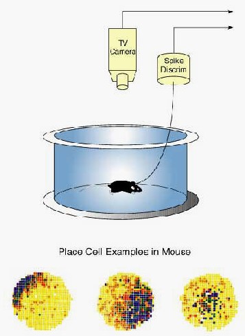 Spatial memory can be studied in the mouse by recording from individual pyramidal cells in the hippocampus. The firing pattern of these "place" cells create an internal representation of the animal’s location within its surrounding. A mouse is attached to a recording cable and placed inside a cylinder (49 cm in diameter by 34 cm high). The other end of the cable goes to a 235-channel commutator attached to a computer-based spike-discrimination system. The cable is also used to supply power to a light-emitting diode mounted on the headstage the mouse carries. The entire apparatus is viewed with an overhead TV camera whose output goes to a tracking device that detects the position of the mouse. The output of the tracker is set to the same computer used to detect spikes, so that parallel time series of positions and spikes are recorded. The occurrence of spikes as a function of position is extracted from the basic data and is used to form two-dimensional firing-rate patterns that can be numerically analyzed or visualized as color-coded firing-rate maps. Dark areas indicate regions in the circular enclosure in shich the cells fires at high rates.