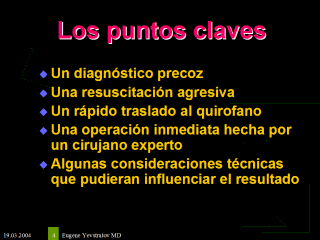 radica en la técnica quirúrgica misma sino en: - un diagnóstico precoz - una resuscitación agresiva - un rápido traslado al pabellón - una operación inmediata hecha por un cirujano experto - algunas consideraciones técnicas que pudieran influenciar el resultado |