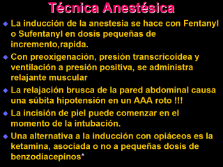 *Una alternativa a la inducción con opiáceos es la ketamina, asociada o no a pequeñas dosis de benzodiacepínicos, que por su acción estimulante sobre el sistema cardiovascular, puede parecer atractiva. Sin embargo la ketamina puede tener efectos depresores cardiovasculares en pacientes con condiciones hemodinámicas tan extremas. |