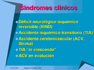 • Accidente isquémico transitorio (TIA): déficit neurológico agudo, focal, que se resuelve sin secuela en menos de 24 horas.