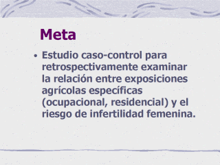 | El estudio fue propuesto en 1996 e iniciado en 1997 para explorar exposiciones específicas y factores de riesgo agrícolas de infertilidad femenina. |