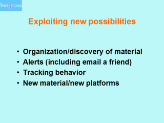 frustration -delighted us Need to organise Collected resources Topograhical collections Series - theme issues; better classification Alerting Editor's choice Press release TOC Customised @lerts - fastest growing People 80 000 >Email a friend 5000 2500 back in. |