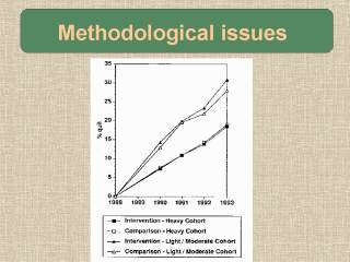This is one of the best recent example of a randomized trial of a community-based intervention. This slide shows that for heavy smokers the observed quit rates were very similar between the smokers in the experimental and control communities but slightly higher for the light to moderate smokers in the experimental communities. |