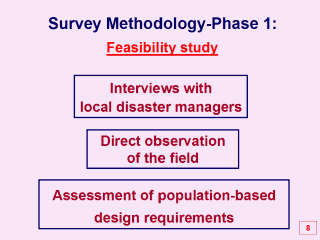 Herein I ’d like to discuss with you some methodological points, which I have learned and used and may be applied in the same situations.During the first day visit of Bam the following assessments were done. First, a feasibility study including: 1) Interviews with local disaster managers to assess their knowledge and attitude toward the necessity of research activities after an earthquake and to estimate their level of supports and possible limitations 2) To estimate the available facilities for data collection such as transportation and basic needs of interviewers consisting of tents, food, water and latrines. 3) Assessment of population-based design requirement, including living status of people by direct observation and asking for available information of geographical distribution of population and the map of city. Second, some interviews were done. 1) Ten in-depth interviews with people from different corners of the city to assess their needs, living status and their cooperation. 2) Three interviews with rescue teams about their needs and health problems. |