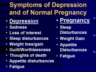 | The symptoms of depression and normal pregnancy overlap. Identification and diagnosis of Major Depression is difficult without proper screening and evaluation. |