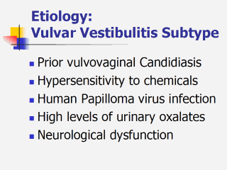 initiating events include chronic infection(s), surgery, or childbirth. Increased prevalence of chronic sub clinical Candida infections have been reported. Vulvar Vestibulitis may originate from a myriad of inflammatory insults on the female genital tract. |