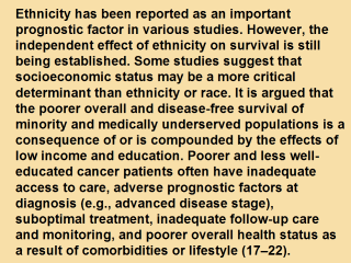 cultural beliefs and attitudes may further contribute to the survival disadvantage of minority patients (23). The effect of cultural beliefs, mores and norms on the quality of a person’s survivorship experience is a virtually unexplored area. |