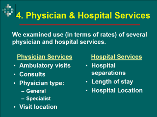Services Ambulatory or "walk-in" visits refer to any contact with a physician while the patient is not hospitalized. These include visits in physician offices, personal care homes, emergency rooms, and outpatient departments. A consult occurs when a client is referred by one physician to another, usually a specialist because of the complexity, obscurity, or seriousness of a patient’s condition, or due to a request for a second opinion. The data available in Manitoba does a good job of counting specialist visits. After the consult, the patient is usually returned to the care of the referring physician. Physician types are classified into seven categories of practice: general practice (includes family physicians) and specialists (psychiatry, paediatrics, obstetrics and gynaecology, medical specialists, general surgeons, and surgical specialists) Hospital Services Both inpatient and surgical outpatient use of hospital services were examined. |