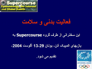 The original of this lecture in English هدف از این مجموعه تلفیق ایده های المپیک با دانش موجود درباره فعالیت بدنی و سلامت است. ggf Supercourse: www.pitt.edu/~super1/ این سخنرانی توسط دکتر سونیتا دودانی برای گروه Supercourse تهیه و توسط دکتر علی اردلان به فارسی ترجمه شده است. |