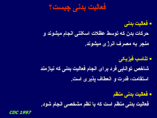 فعالیت بدنی منظم است که فرد در اکثر روزهای هقته، ترجیحا بطور روزانه، 5 روز یا بیشتر فعالیت با شدت متوسط انجام دهد. همچنین به حالتی اطلاق می شود که فرد 3 روز در هفته یا بیشتر را به فعالیت شدید بپردازد. |