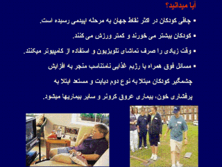 دلایل عمده، عدم فعالیت فیزیکی ناشی از تماشای تلویزیون و استفاده از کامپیوتر می باشند. این مسائل همراه با رژیم غذایی نامتناسب منجر به افزایش چشمگیر کودکان مبتلا به نوع دوم دیابت و مستعد ابتلا به پرفشاری خون، بیماری عروق کرونر و سایر بیماریها میشود. پزشکان می توانند به کاهش این روند کمک کنند. Dempsey T J Okla State Med Assoc. 2004 Mar;97(3):119-21 |