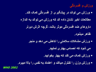 سالانه 18 میلیون نفر در آمریکا از افسردگی رنج می برند. (گزارش CDC 1997). تمام افراد تحت فشار روانی، شامل افراد مضطرب و افسرده می توانند از فواید ورزش بهره مند شوند. فعالیت بدنی منظم باعث بهبود خلق می شود، افسردگی را بر طرف می کند و احساس خوبی را در فرد ایجاد می کند. |