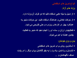 امنیت: § اول ماهیچه هایتان را گرم کنید § روش صحیح استفاده از ابزار و ماشین های ورزش را بدانید. § هنگامی که از وزنه استفاده می کنید، تنها نباشید. § بیش از انداره تمرین نکنید و حدود خود را بدانید. توانایی خود را به تدریج افرایش دهید. تنفس: § نفس خود را نگه ندارید. § هنگام فشار بازدم انجام دهید. از عضلاتتان متعادل استفاده کنید. § عضلات متقابل را تقویت کنید. § برای هر تمرین از هر دو طرف بدنتان استفاده کنید. Exercise for life by Melissa |