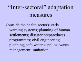 | Strategies to deal with the impacts of climate change on health also need intersectoral adaptation measures and collaboration. The health sector alone, or in limited collaboration with a few sectors, cannot deal with the necessary "primary" adaptation. |