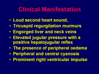 | Later in the course of the disorder, chest pain on exertion, presyncope, or syncope may occur as a result of severe pulmonary hypertension and the inability of a compromised right ventricle to meet the body’s demands for cardiac output. As the disease progresses, the findings on physical examination become consistent with the presence of pulmonary hypertension or right ventricular failure. |