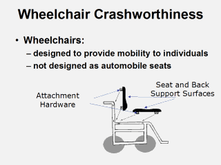 Did you see the Part I of this lecture? Wheelchairs are designed to provide mobility to individuals and not designed as automobile seats, so, in many cases, the level of protection that wheelchair and its seating systems can provide under impact is unknown. WCSSs are often provided as add on or replacement products after the wheelchair has been in the field, so they will not be sled tested by the ANSI/RESNA WC/19 standard. Therefore, as part of wheelchair transportation safety researches, crashworthiness of wheelchair seating systems have been also evaluated. |