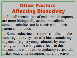 2001). Furthermore, not all endocrine disruptors need to be altered biochemically in order to be biologically more available or active. A field study (Fairchild et al., 1999) indicated that nonylphenol can interfere with the normal growth and reproductivity of salmon smolts by mimicking the role of estrogen. The nonylphenol compound used in the study was an inert ingredient surfactant added to aid an insecticide to dissolve in water for easier spraying. The study showed that after exposure to nonylphenol, salmon smolts could not switch their osmoregulatory system from fresh water (where they hatch) to salt water (into which they migrate in the first fall of their life). Thus when the salmon smolts reached the ocean after migrating downstream, they died. This switch is normally mediated by estrogen. The inability of the smolts to switch their osmoregulatory system was apparently disrupted by nonylphenol's estrogenic effects, as substantiated in a laboratory study by Madsen et al. (1997). Here it is the salmon’s osmoregulatory system that makes nonylphenol’s estrogenic effects more distinct and bioactive. (Note that a fish’s osmoregulatory system consists of a set of bodily structures and functions responsible for regulating the concentration of dissolved substances in its cells, despite changes of the concentrations in the surrounding medium.) |