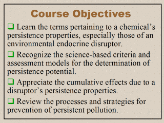 exposure to EEDs at the wrong time or in the wrong place. The objectives of this part, Part III of the lecture, are for students: (1) to learn the terms and definitions used, especially those having direct relevancy to a chemical’s persistence; (2) to recognize the two major aspects of persistence and the science-based criteria for persistence and bioaccumulation determination; (3) to appreciate the cumulative effects that are made more possible due to a chemical’s persistence properties; and (4) to review the methods, the models, and the strategies developed for assessing a chemical’s persistence potential and for the removal or the reduction of such potential. From the literature data presented in Part III here, it shall further become evident that the majority of the persistent and bioaccumulative chemicals now detected in the environment are pesticides applied or present worldwide. As summarized in Part I, many of these persistent bioaccumulative pesticides have been listed as substances potentially quite capable of disrupting the endocrine system in humans and wildlife. |