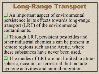 Statement, 2003). Another indication of this importance is the editorial comments by Matthies and Scheringer (2001) concerning the occurrence of pesticides and other industrial chemicals in the Arctic, which is a rather remote region of the earth. As they put it, "These substances have never been emitted in such regions and, thus, must have been transported over long distances from moderate or even tropical climatic zones." Contrary to classic belief, the mode of LRT is no longer restricted to atmospheric. There are data (AMAP, 1997) showing that nuclear wastes and certain persistent organic pollutants (POPs) can be transported in ocean currents over long distances, such as from reprocessing plants in Europe to the Arctic Ocean. In addition, as already discussed in Part II in relation to bioaccumulation, at least one study (Ewald et al. 1998) suggested that POPs like PCBs can be transported over a long distance by animal migration, such as by pacific salmon.Interestingly enough, with the aid of storms or cyclone activities, even soil dust emitted from the Chinese and Mongolian arid regions could be transported over the North Pacific Ocean, all the way to North America (Takemura et al., 2002). |