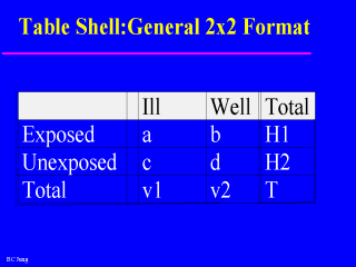 titles, headings, categories. This is an example of a two variable table. Disease status (Ill, Well) is usually noted along the top of the table (x-axis). Exposure status (Exposed, Unexposed) is along the side (y-axis).