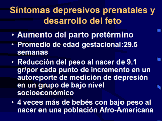 fetal. Muchos estudios ajustaron para los efectos de edad, nivel socioeconómico, y aún encontraron relación entre los síntomas depresivos y bebés de pretérmino y bajo peso al nacer. Un estudio mostró asociación entre síntomas depresivos a las 32 semanas con aumento del riesgo de analgesia epidural, operación cesárea, parto instrumental, y admisión a UCN. Chung et al (2001). Antepartum depressive symptomatology associated with adverse obstetrics and neonatal outcome . 63:830-834. RR en una población Afro-Americana, de bajo ingreso es 1.59 para nacimiento pretérmino espontáneo (Orr et al. 2002 American Journal of Epidemiology 156:797-802 Nacimiento pretérmino espontáneo es definido como el nacimiento antes de las 37 semanas completas de gestación. |