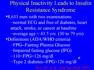 physical activity and diabetes. Fewer still have investigated fitness and diabetes. * 7,442 of the men were free of IFG at baseline Average follow-up = 6 years 52,588 man-years of observation 149 new cases of type 2 diabetes 593 new cases of impaired fasting glucose Incidence of type 2 diabetes = 2.8/1,000 man-years (similar to other white populations) |