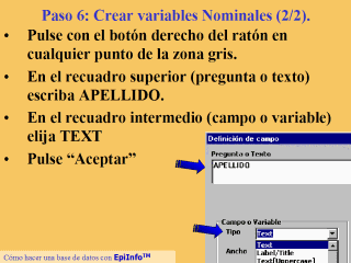 Para ello creamos un campo que se llama APELLIDO y elegimos que el formato de esa variable sea de TEXTO (TEXT). En esta variable o campo se pueden introducir caracteres alfabéticos. Nos servirá para conocer el apellido de los individuos.