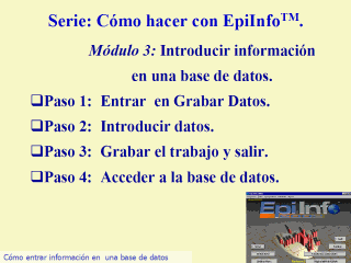 muestra el proceso de entrada de información en la base de datos. Esta acción vuelca la información sobre papel en un formato electrónico. Para ello debemos 1º capturar la base de datos (CONSULTA) 2º Introducir los datos de cada paciente 3º Guardar el trabajo. En este ejemplo vamos a introducir los datos de tres pacientes simulados. |