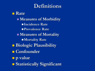 fast a disease or condition is occurring in a population. Measures of Morbidity Incidence is the number of new cases of a particular disease that occurs during a specified period of time divided by the number of persons in the population that is at risk for developing the disease. Prevalence is the number of affected persons present in the population at a specific time divided by the number of persons in the population at that time. Measures of Mortality Mortality Rate is the number of deaths at a specific time divided by the number of persons in the population at that time. Biologic Plausibility is a theory, based on existing medical literature, that supports the relationship or causal link between physical activity and a particular disease or health outcome. A confounder is a variable with an effect that is entangled with the effect of physical activity which cannot be easily separated and studied independently. Confounders need to be controlled for using statistical procedures to ensure accurate results. For a variable to be considered a confounder in physical activity epidemiology, it has to be related to both physical activity and the disease and/or health outcome of interest. Confounders in physical activity epidemiology include: age, BMI, and baseline health status. For example, when looking at the relationship between inactivity and physical inactivity, age may be a confounder because both heart disease risk and physical inactivity increases as one ages. In this case, it may be hard to determine if age or physical inactivity lead to the development of heart disease. p value is used to quantify the degree to which chance may account for an association that was observed in a particular study. Using statistical procedures, researchers decide whether an association between a disease or health outcome and physical inactivity is statistically significant. The p value allows researchers to quantify the probability or likelihood that the association could have occurred by chance alone. Recommended Readings: Gordis L (2000). Epidemiology (2nd ed.). Philadelphia, PA: W.B. Saunders Company. |