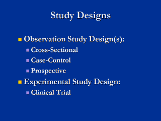 | The following slides will discuss, in greater detail, both observational and experimental study designs. Observational study designs include: cross-sectional, case-control, and prospective studies. The clinical trial is an example of an experimental study design. |