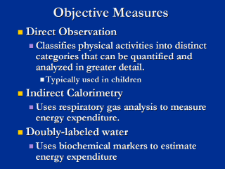 physiological criteria. Indirect Calorimetry measures oxygen consumption and carbon dioxide production over short or long periods of time. For short durations, participants wear a face mask during rest and/or exercise. For longer durations, individuals are confined to a metabolic chamber. Doubly-Labeled Water is a biochemical procedure that estimates energy expenditure through the use of markers that reflect the rate of metabolism in the body. During the procedure, two stable isotopes of water are ingested by the study subject. After a 1 to 2 week period, investigators determine how quickly the body lost the water isotopes. The water isotopes can be lost through urine, sweat, and/or evaporation. The investigators measure the difference between the rate of loss of the two water isotopes to determine energy expenditure. PROS. Indirect calorimetry and doubly-labeled water are precise and accurate measures of total energy expenditure. CONS. Both indirect calorimetry and doubly-labeled water have high participant burden and both measures are costly; therefore, may not be feasible in large epidemiological studies. Recommended Reading: Welk GJ (2002). Physical activity assessments for health-related research. Champaign, IL: Human Kinetics. |
