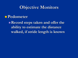 pedometers may be subject to patient tampering. Recommended Reading: Crouter SE, Schneider PL, Karabulut M, Bassett DR Jr (2003). Validity of 10 electronic pedometers for measuring steps, distance, and energy cost Medicine & Science in Sports & Exercise; 35:1455-1460. Schneider PL, Crouter SE, Bassett DR (2004). Pedometer measures of free-living physical activity: comparison of 13 models. Medicine & Science in Sports & Exercise; 36 :331-335. |