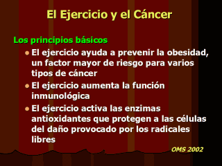 través del tracto gastrointestinal, reduciendo el riesgo de cáncer de colon. Por ejemplo .Cáncer de mama: Los elevados niveles de estrógenos circulantes influyen en el desarrollo del cáncer que se produce en el sistema reproductor femenino; el ejercicio reduce los niveles de estrógeno circulante, reduciendo por consiguiente el riesgo. |
