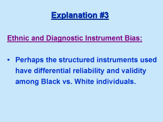 | Numerous reports on psychometric properties of all 3 instruments. In general, substance abuse/dependence diagnoses shown to have the highest level of diagnostic agreement. Similar results observed by race and cross-ethnic evaluations. Wording of all 3 instruments designed to be straightforward and unambiguous. Finally, consistent results of lower rates in Blacks across all 3 studies with different instruments suggest possible overall bias rather than instrument specific bias. |